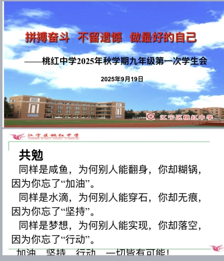 为明确初三学生在关键学年的奋斗方向,凝聚学生力量,激发学习热情,9 月 19 日,桃红中学在学校报告厅隆重开展初三学生会活动。初三全体学生、班主任及学校领导共同参与此次活动,为即将开启的初三冲刺阶段注入强劲动力。