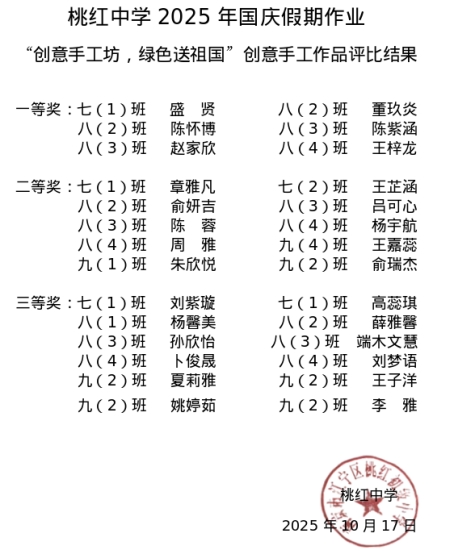 为深化“双减”背景下的素质教育实践,将劳动教育与爱国主义教育融入假期生活,江宁区桃红初级中学于2025年国庆假期后顺利开展学生作业评比活动。活动聚焦创意实践与情感表达,设置三大特色赛道,最终评选出多个一二三等奖项,为这个国庆假期画上了充满意义的句号。